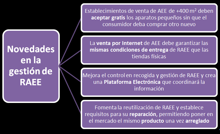 La nueva reglamentación obliga a los establecimientos de venta de aparatos eléctricos y electrónicos de más de 400 m2 a aceptar gratis los productos desechados pequeños (móviles, tablets, etc.), sin que el consumidor tenga que comprar otro nuevo; y la venta por Internet debe garantizar las mismas condiciones de entrega de RAEE.